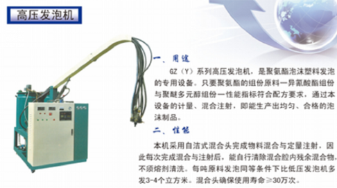 高壓發(fā)泡機(jī)GZ(Y)系列高壓發(fā)泡機(jī),是聚氨酯泡沫塑料發(fā)泡的專用設(shè)備。只要聚氨酯的組份原料一異氰酸酯組份與聚醚多元醇組份性能指標(biāo)符合配方要求,通過本設(shè)備的計(jì)量、混合注射,即能生產(chǎn)出均勻、合格的泡沫制品。